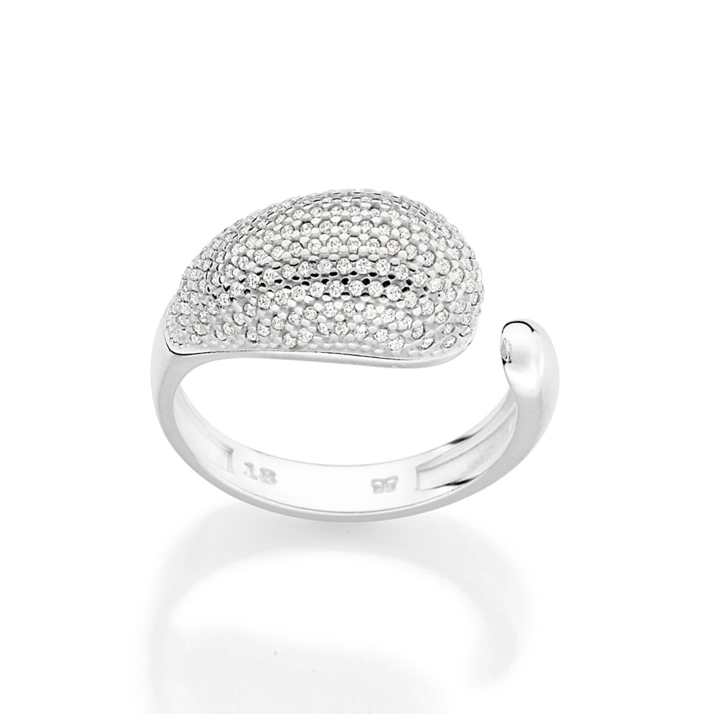 Anel ajustável gota abaulada cravejado por 183 zircônias de 0,80 mm.