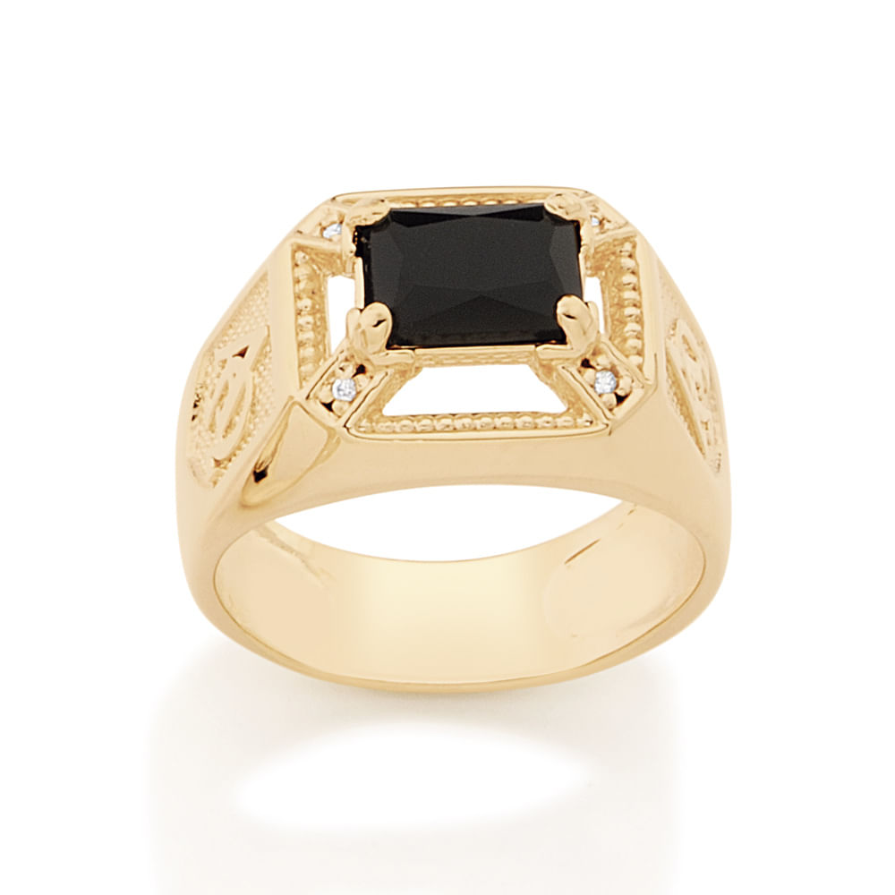Anel de formatura retangular com símbolo grego "alfa e ômega" nas laterais, 1 cristal retangular de 6x8 mm e 4 zircônias de 1,25 mm na parte superior.