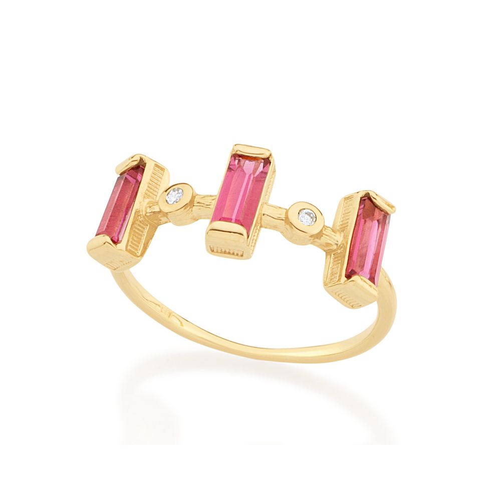 Anel skinny com 3 cristais facetados retângulares de 3 x 7 mm interlacadas por 2 zircônias redondas de 1,50 mm.