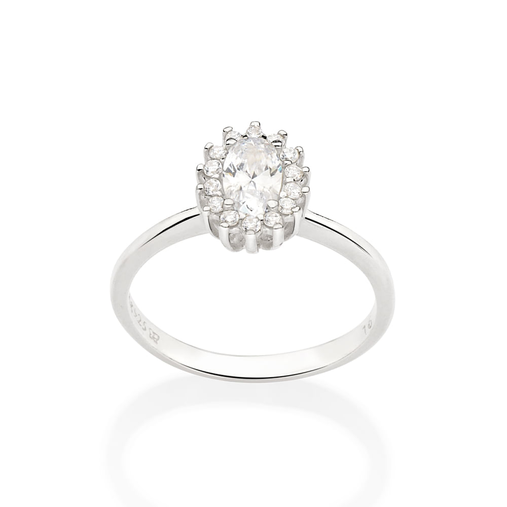 Anel solitário cravejado por 14 zircônias de 1,25 mm e 1 zircônia oval de 4x6 mm ao centro.