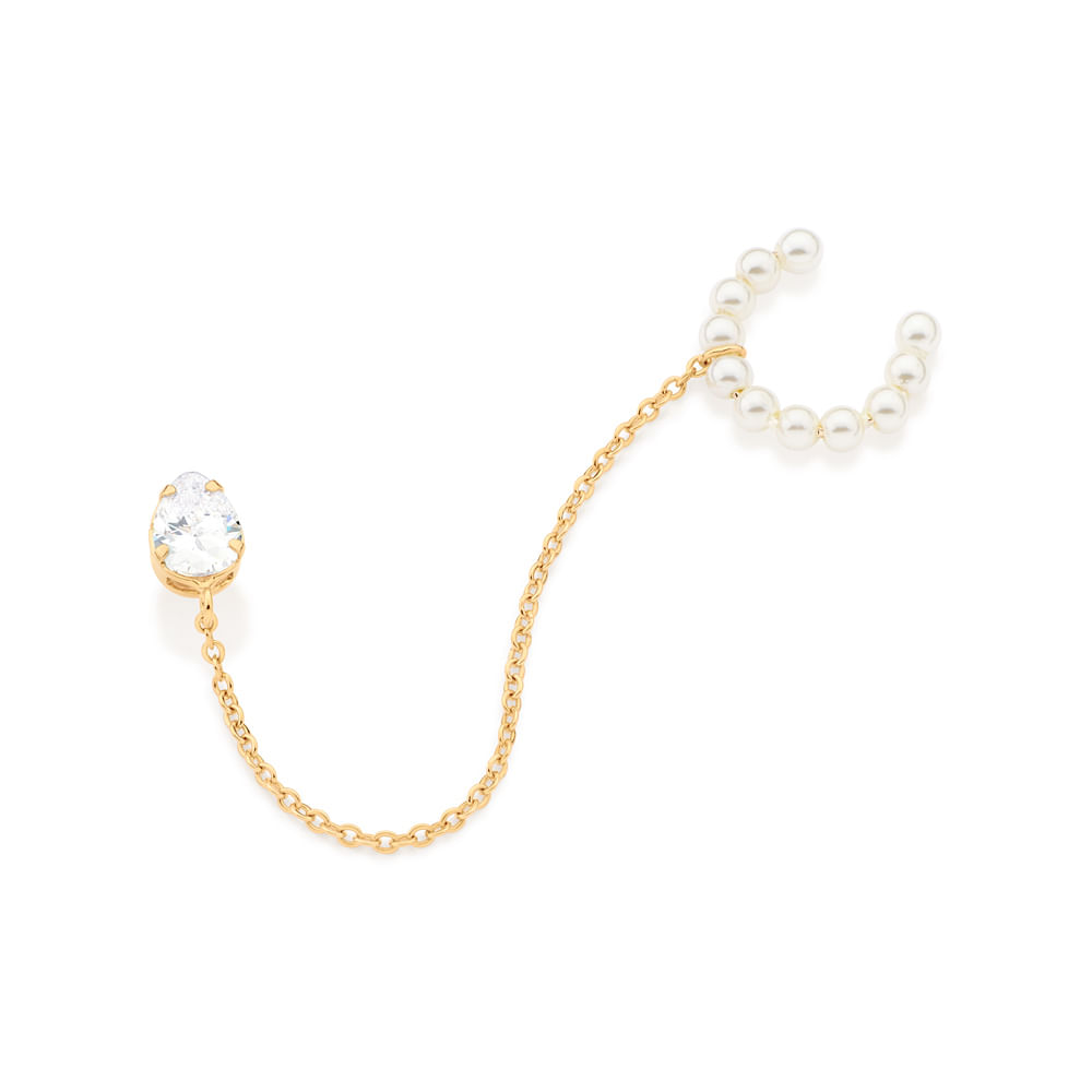 Brinco solitário com 1 zircônia gota de 6x8 mm, com piercing de pressão composto por 11 pérolas de 3,0 mm, interligados por corrente de elo cadeado laminado fio 0,35mm.