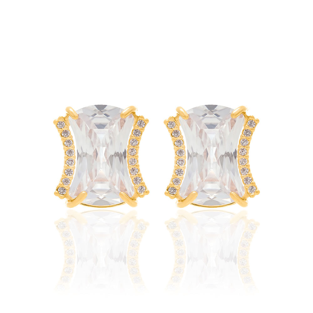 Brinco retângular cravejado por 34 zircônias (par) sendo as das laterais de 1mm e a do centro de 6x12mm. med 1,2 cm