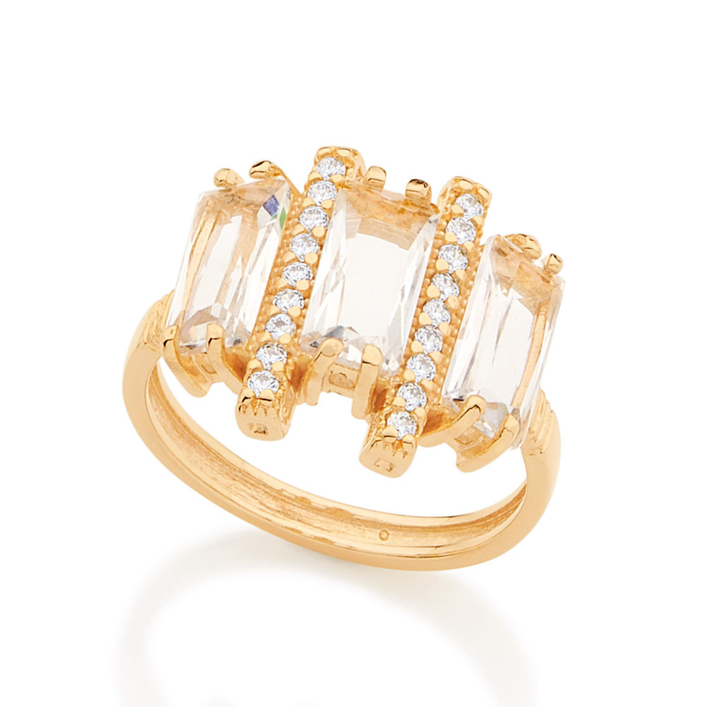 Maxi anel com 3 cristais retângulares de 5x10mm intercalados por palitos com 18 zircônias de 1,50mm.