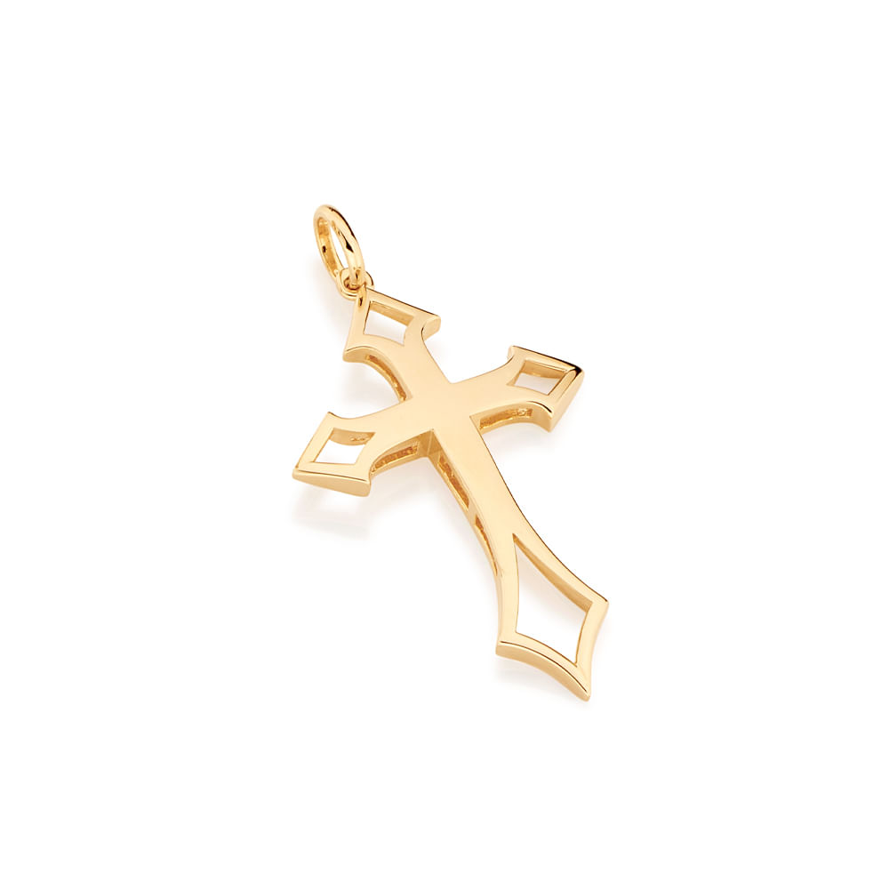 Pingente formato cruz com detalhes vazados nas pontas e laterais tendo o centro liso. med 4,1 cm